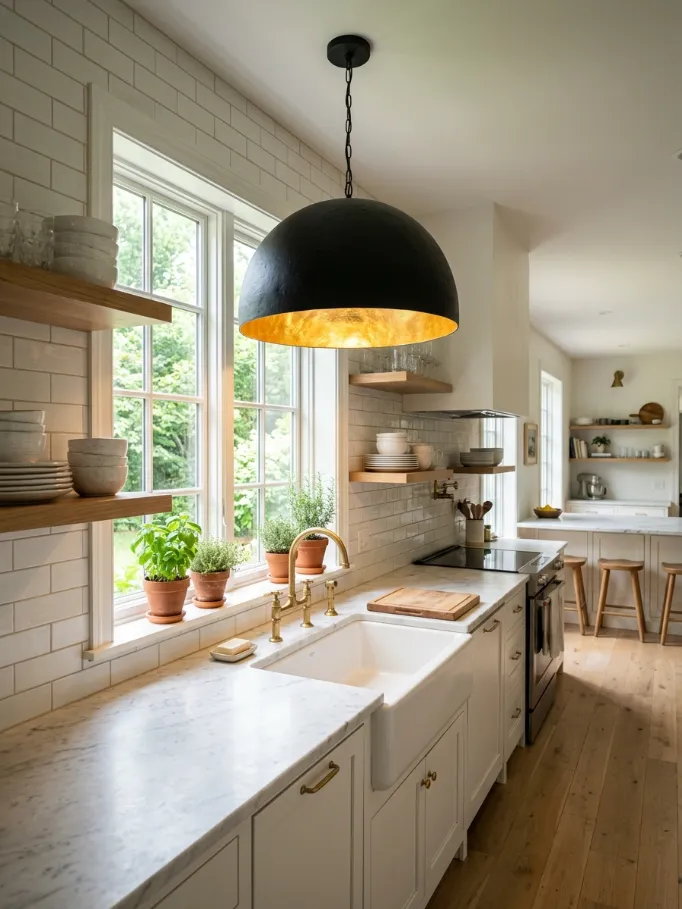 A black lantern pendant with gold interior and hardware details hung low over the sink adds serious character while giving you the focused task light you actually need for washing up and food prep. This is one of those small upgrades with outsized impact.