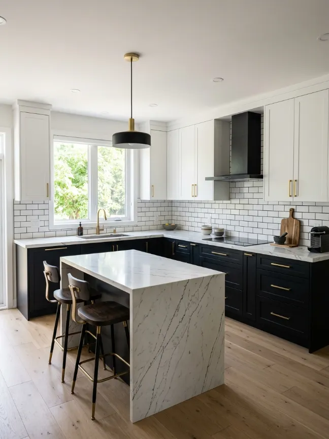 Add gold hardware to both, and it ties everything together beautifully. Also — and this is purely from experience — black lower cabinets hide scuffs, kick marks, and general life so much better than white ones.