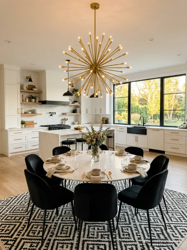 If your kitchen flows into a dining area, a gold chandelier ties the whole open-plan space together beautifully.