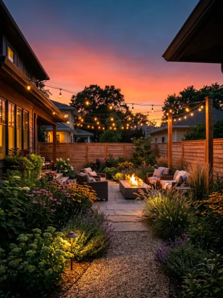 Okay, slightly off-topic from pure landscaping, but hear me out — warm string lights draped along the fence line change the entire atmosphere of a backyard at night.