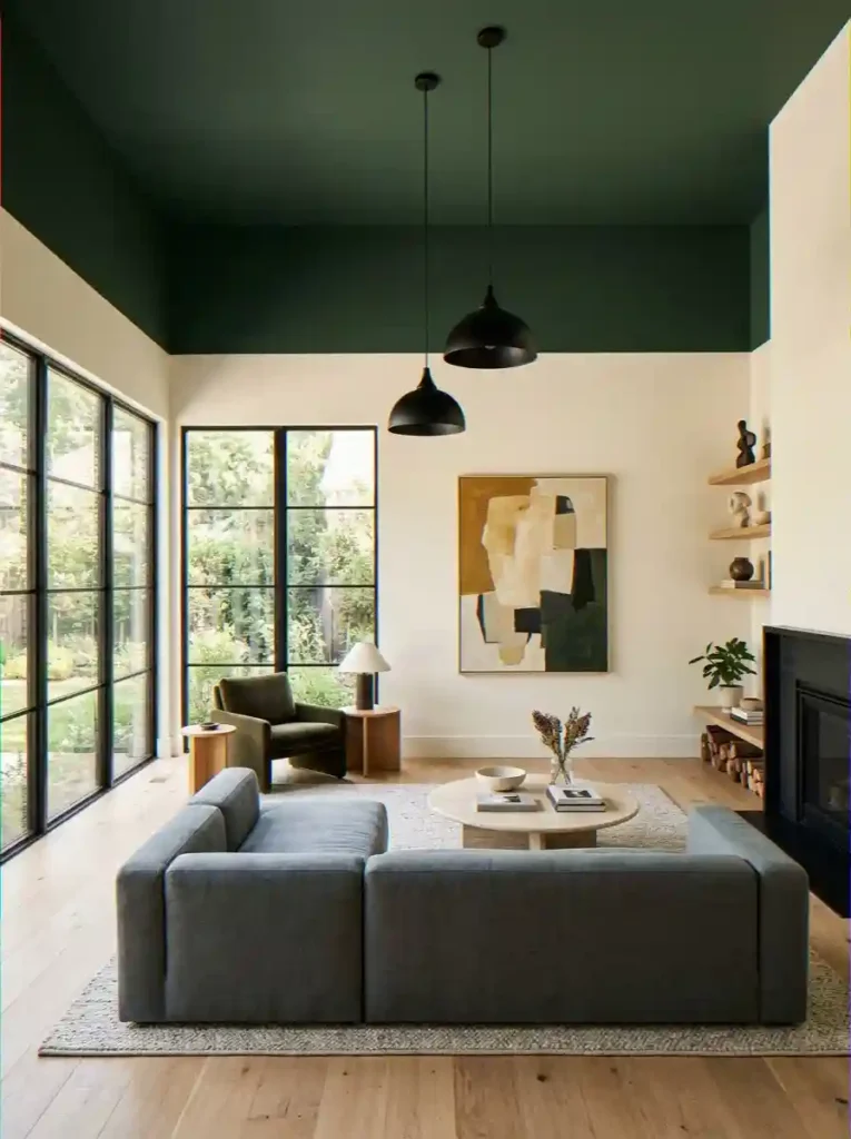 • Dark-painted ceilings — navy, forest green, charcoal, even black — are the biggest breakout trend in residential interiors right now. The “fifth wall” concept has gone fully mainstream.